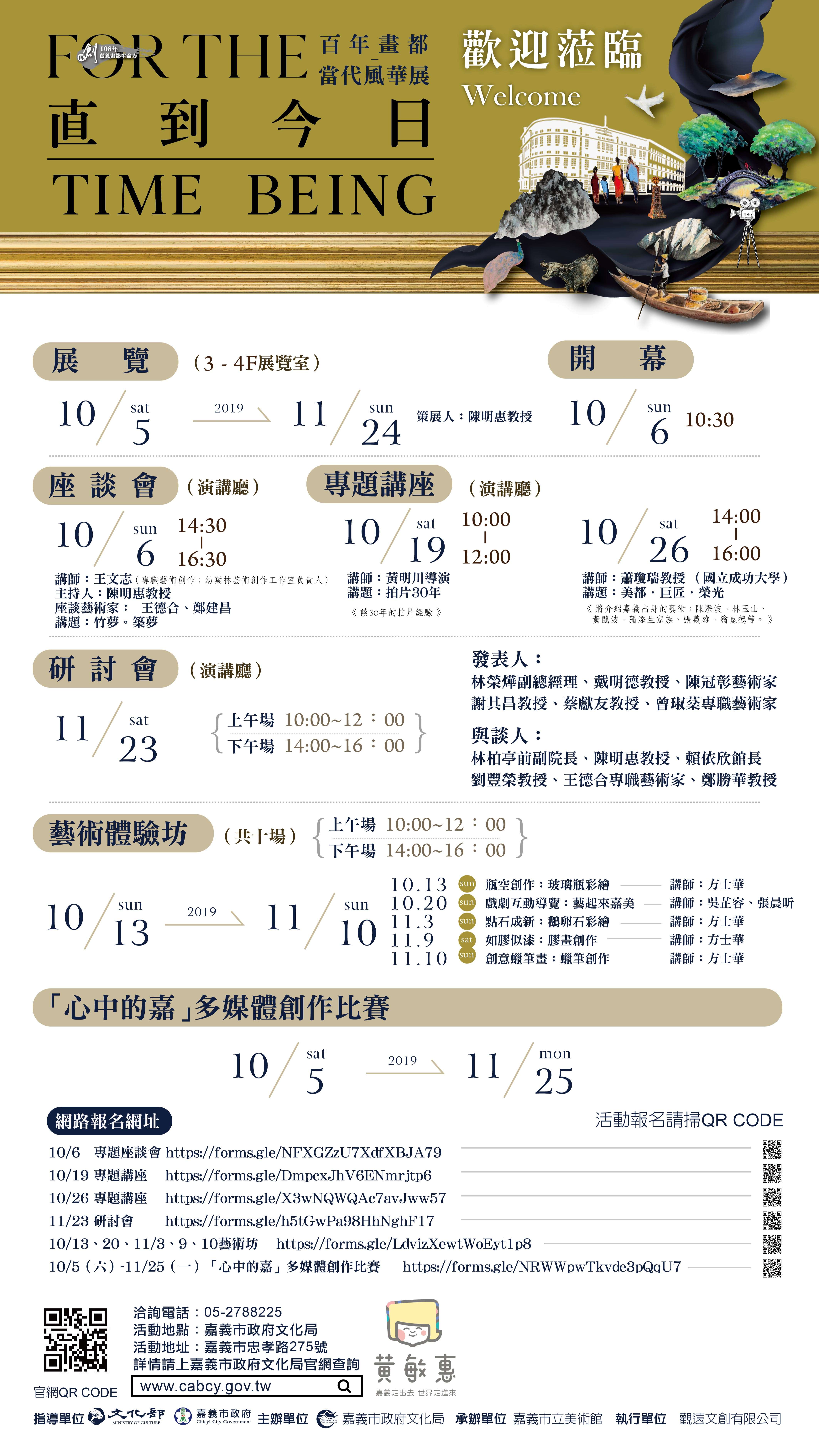 一、旨案主題展:「直至今日」於108年10月6日至11月24日在嘉義市政府文化局3及4樓展覽室展出。