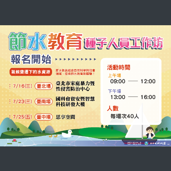 四、本活動預定於北、中、南各辦理上、下午1場次,每場次參與人數為40人(額滿為止),報名一律採BeClass報名系統(網址:https://reurl.cc/M3OOkv),全程參與該場次工作坊者核予教師研習時數3小時,並贈送「省水小縱隊」卡牌1組。