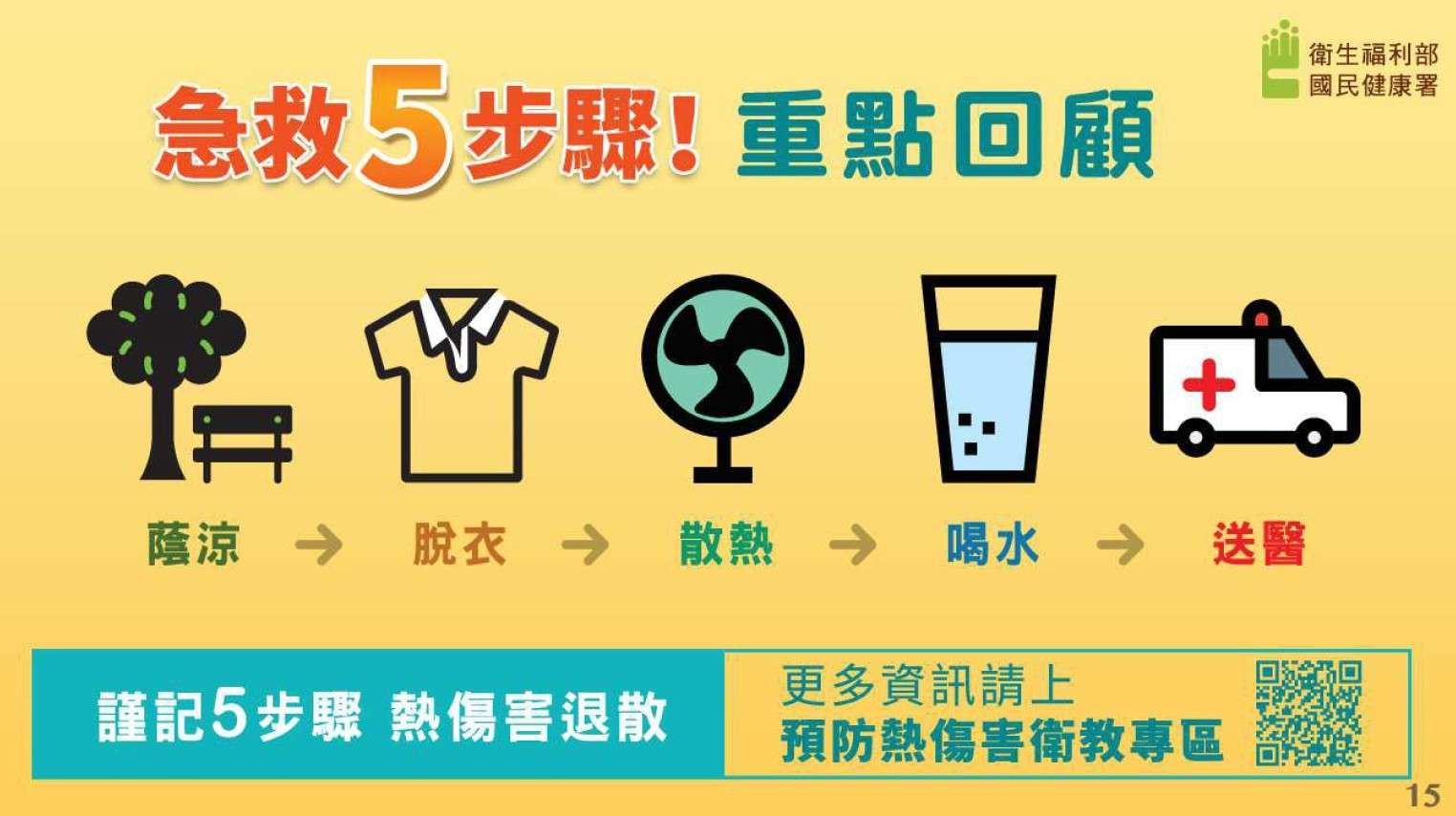 當熱傷害真的發生的時候,保持冷靜且理性的態度協助患者,除了穩定患者的心情,也可以加速急救的速度,牢記「蔭涼」、「脫衣」、「散熱」、「喝水」、「送醫」五個步驟,將患者的熱傷害程度降到最小,「不用酒精、不用退燒藥」,不讓錯誤的迷思耽誤了患者的就醫治療,雖然我們不一定是專業醫護人員,卻也可以透過這些步驟幫助熱傷害患者。