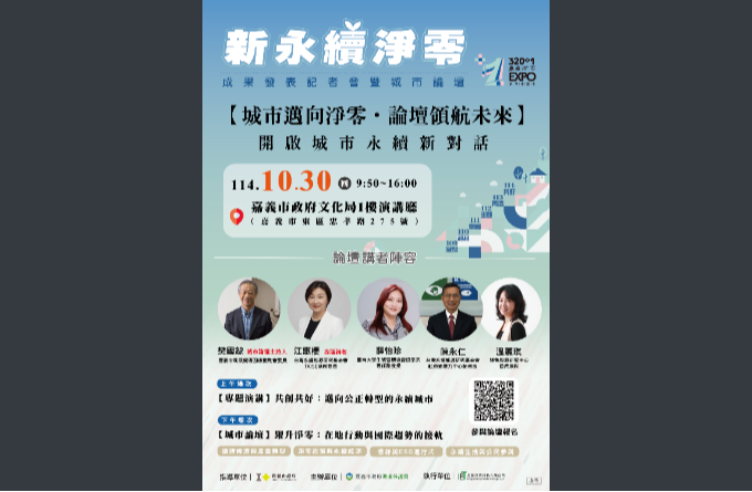 二、為展現本府推動「十大旗艦計畫-新永續淨零」政策成果,落實永續發展目標(SDGs),定於114年10月30日(星期四)上午9時50分至下午4時,假嘉義市政府文化局1樓演講廳(嘉義市東區忠孝路275號)辦理「320+1嘉義市新永續淨零成果發表記者會暨城市論壇」,藉以展示本市氣候變遷因應推動會各推動小組之執行成果與亮點。