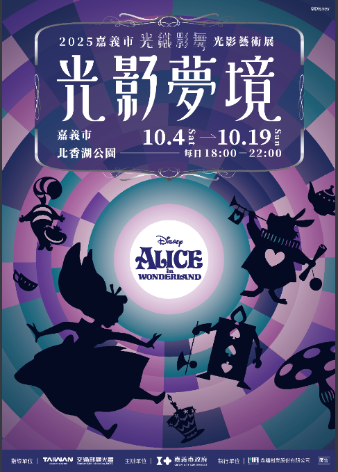 「2025嘉義市光織影舞」將在10月4日至10月19日奇幻登 場,今年再度展現吸睛創新手法,以超過150年歷史、家喻 戶曉的迪士尼經典動畫《愛麗絲夢遊仙境》為活動主題, 規劃8大光影藝術展區,打造30米長如夢似幻的沉浸式光環 隧道、9米高的愛麗絲造型氣偶,並在北香湖面打造4.5米 高多層次轉動的月亮等,結合城市場域,打造專屬嘉義市 的奇幻入口。